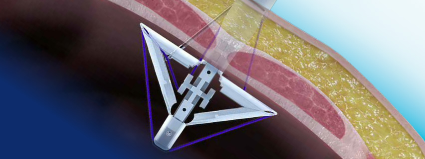 Insert the device into the defect and use the slide lock to engage wing shields. Once the wings are locked, position them against the abdominal wall. The suture retriever exit line should be below skin level to ensure an optimal suture purchase.