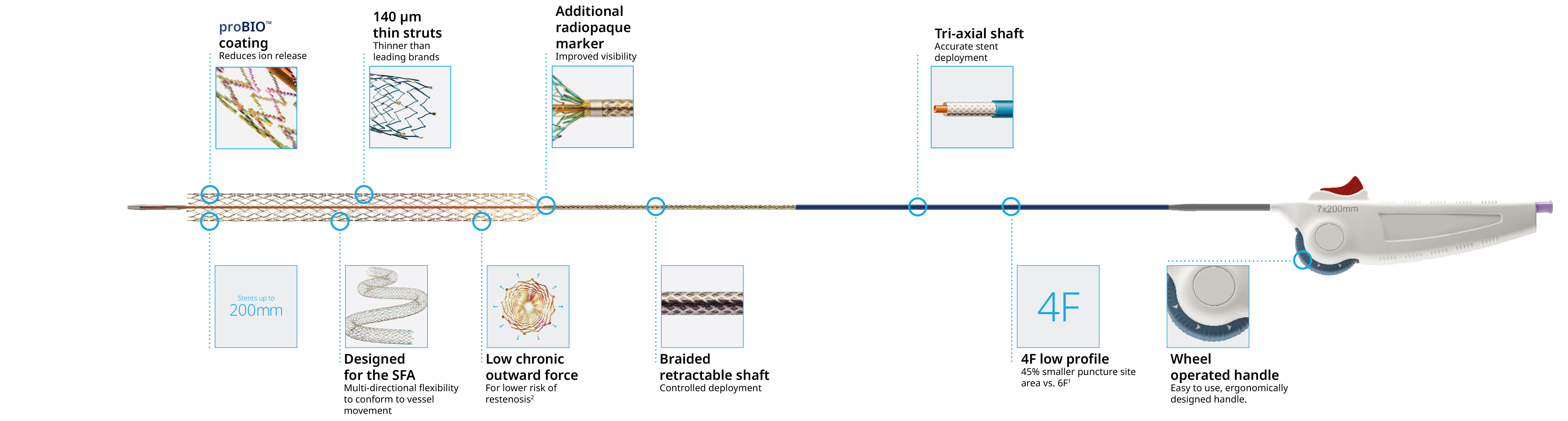 Pulsar-18 T3 is the first clinically-proven thin strut stent mounted on a tri-axial low profile (4F) delivery system. It is indicated for use in patients with atherosclerotic disease of the superficial femoral, proximal popliteal and infrapopliteal arteries and for the treatment of insufficient results after Percutaneous Transluminal Angioplasty (PTA), e.g. residual stenosis and dissection.*