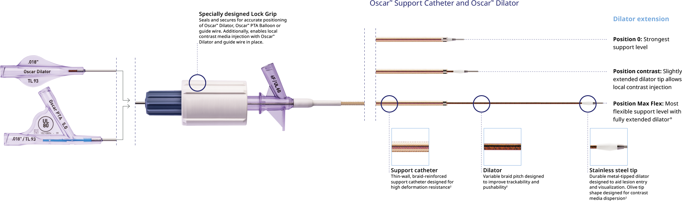 The Oscar Support Catheter allows variable guide wire support for accessing and crossing lesions to reduce the need for guide wire escalation or multiple support catheters.