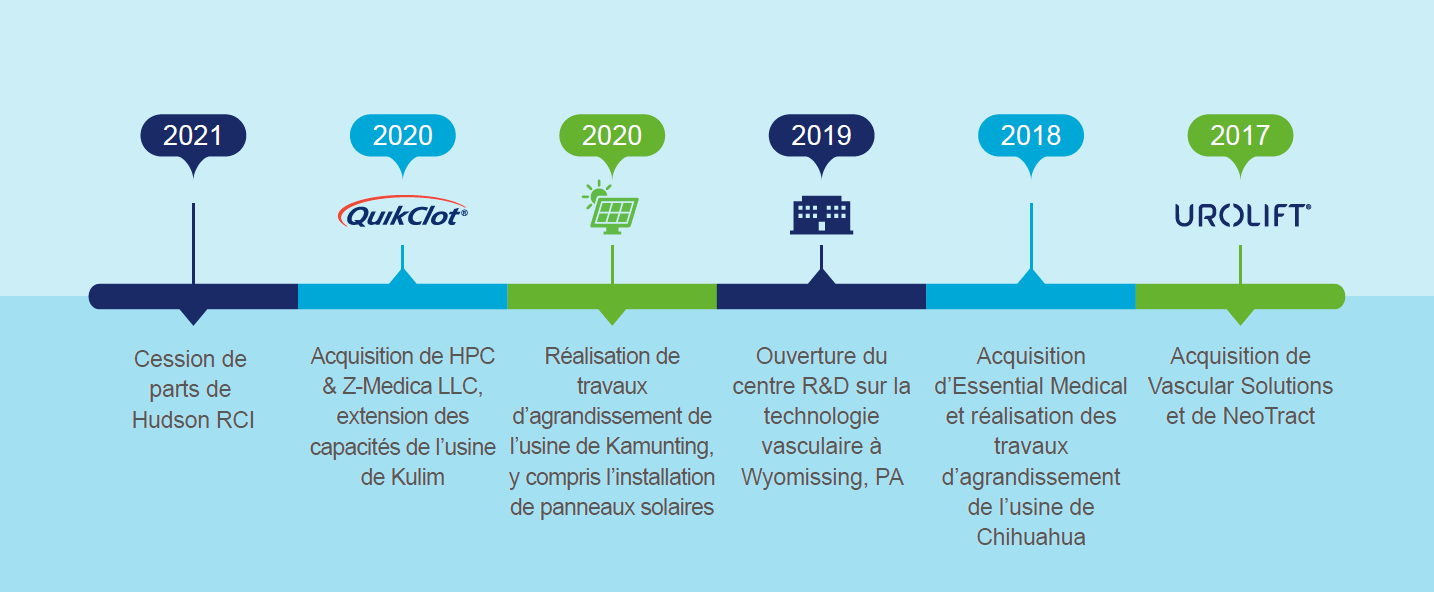 Au fil de notre existence, nous avons consolidé nos bases et favorisé le changement en capitalisant sur la recherche et le développement en interne, mais aussi sur les partenariats externes et les acquisitions stratégiques. Nous resterons fidèles à cet esprit, à nos valeurs fondamentales, à notre objectif et à notre vision, et nous continuerons à façonner l’avenir des soins de santé.