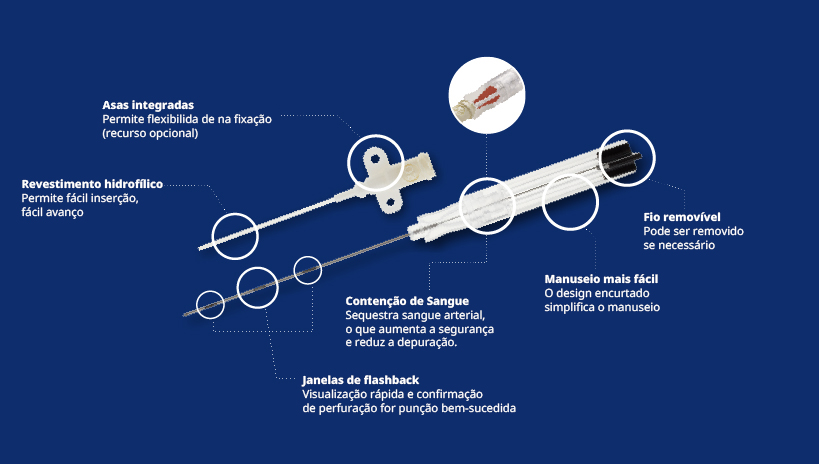 Um marco na cateterização arterial ao oferecer o primeiro design integrado. Possibilita inserções rápidas e fáceis com altas taxas de sucesso. Redução do risco de contaminação e do contato com o sangue.